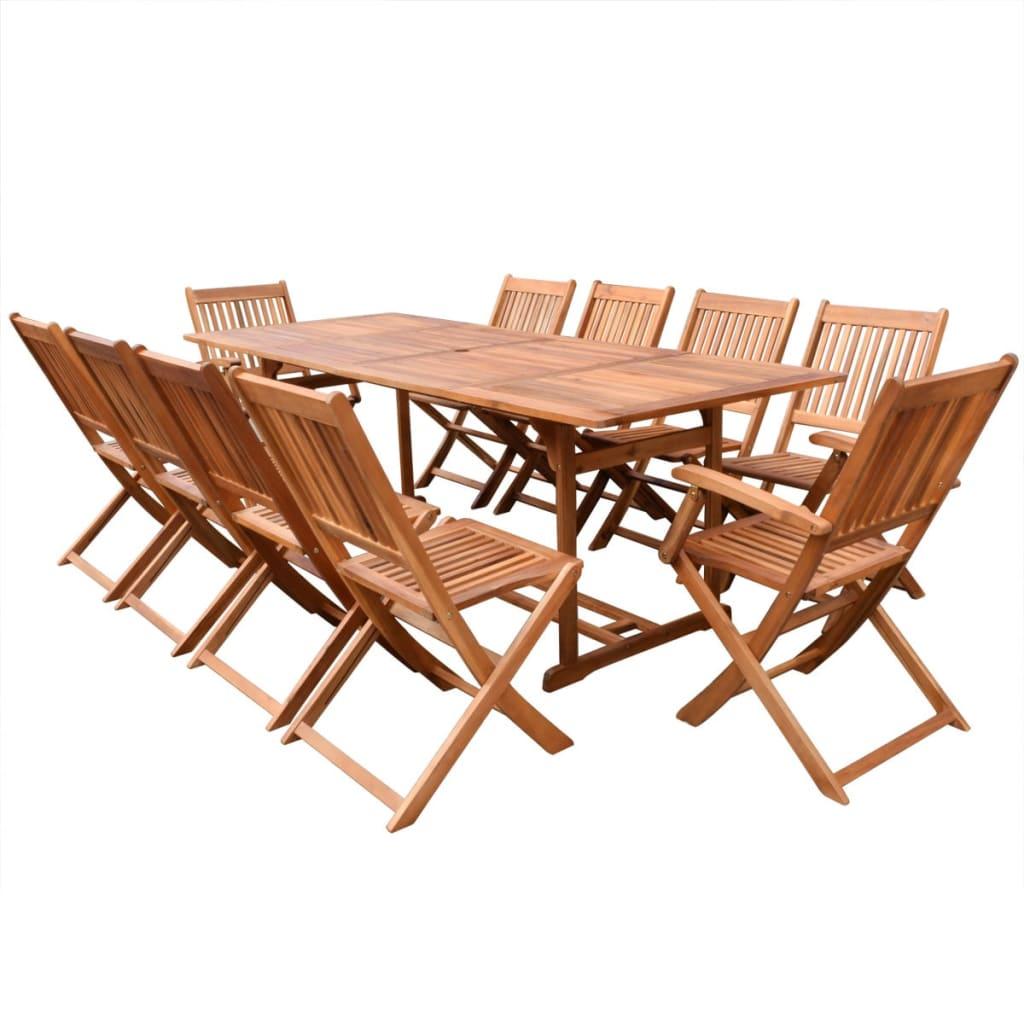 Puidust õuemööblikomplekt koosneb 1 lauast ja 10 toolist. See mitte ainult ei loo täiendavat istumisruumi, vaid lisab ka maalähedast stiili teie aeda, terrassile või rõdule! Aiamööblikomplekt on valmistatud kvaliteetsest akaatsiapuidust, troopilisest lehtpuust, mis on ilmakindel ja väga vastupidav. See õhkab maalähedast ja looduslikku sarmi. Aiamööbel on suurepärane segu stiilsusest ja vastupidavusest. Komplekti kuulub 1 laud, 2 käetugedega tooli ja 8 ilma käetugedeta tooli. Aiamööblikomplekti on lihtne kokku panna.
