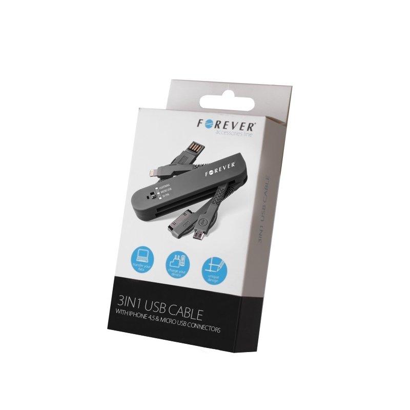 FOREVER 3in1 Cable Set - iPhone 4/4S 30pin - Apple Lightning 8pin - Micro USB Black (EU Blister)