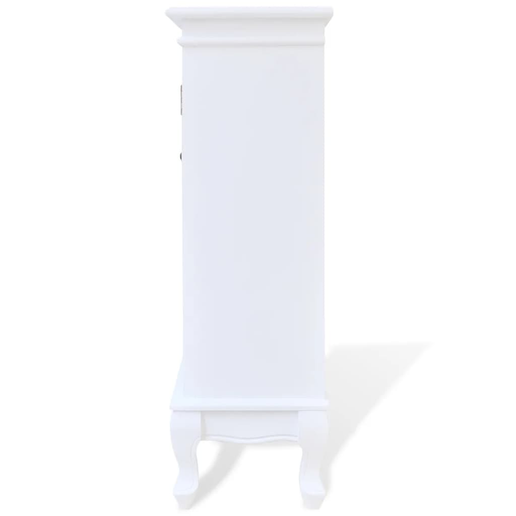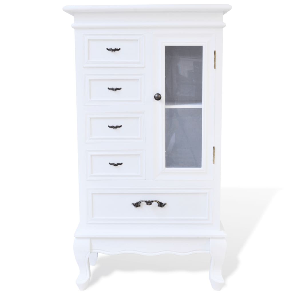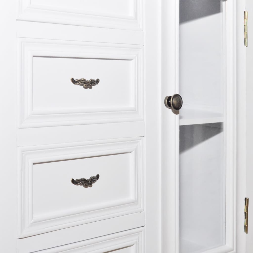 Antiikstiilis kapp on suurepärane täiendus kontorisse, elutuppa, magamistuppa, esikusse ja mujale. Viies sahtlis on võimalik hoiustada riideid, raamatuid, pabereid ja muid vajalikke asju. Kahele riiulile mahub hulgaliselt esemeid ja klaasist uks kaitseb kapi sisu mustuse ja tolmu eest. Kapp on valmistatud kvaliteetsest MDFist ja valge viimistlusega männipuidust ning see peab aastaid vastu.• Tarne 5–7 päeva kõikjale Eestis • Turvalised maksemeetodid: Paypal, pangaülekanne, deebet- ja krediitkaardid, Trustly • Uhiuus toode. 2-aastane garantii • Tasuta tagastamine 30 päeva jooksul