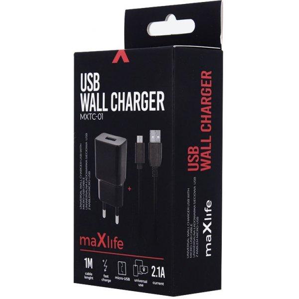 Mobiili lisaseade Maxlife MXTC-01 1x USB 2.1A Black + microUSB