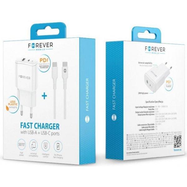 Mobiili lisaseade FOREVER TC-01-20AC PD QC 1x USB-C 1x USB 20W White + USB-C - USB-C