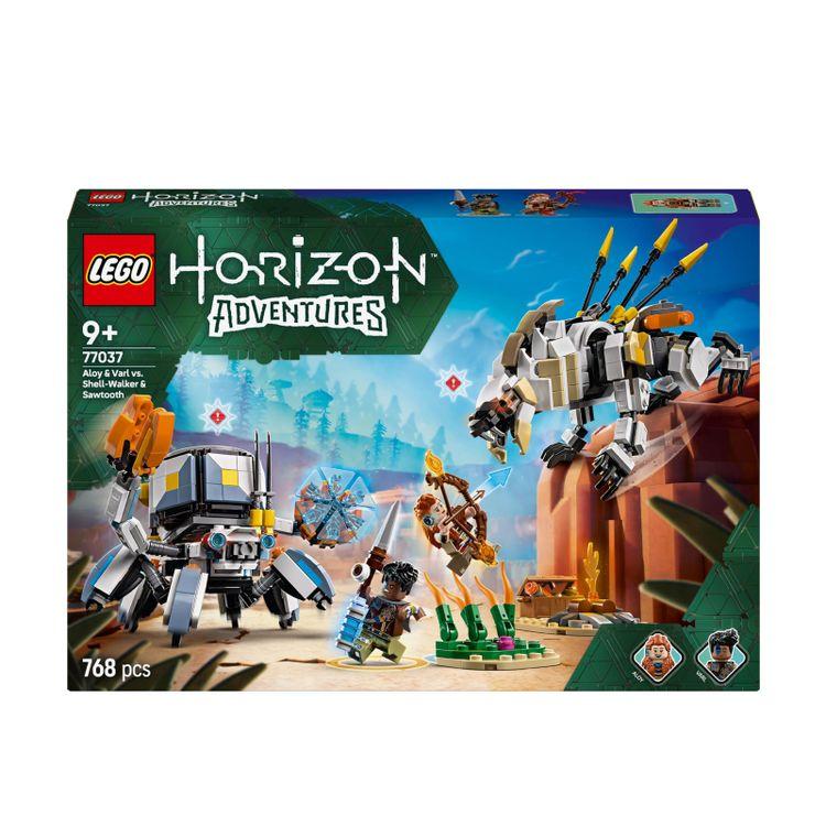 LEGO® Horizon Adventures™ Aloy ja Varl vs. Shell-Walker ja Sawtooth (77037) on kogutav fantaasiamänguasi alates 9-aastastele lastele.Videomängul LEGO Horizon Adventures põhinevas LEGO mängukomplektis on 2 minifiguuri: Aloy ja tema lojaalne liitlane Varl. Aloy kannab vibu ja Varl oda. Igal relval on lisad, et käivitada tule-, külma- või šokirünnakuid, täpselt nagu videomängus. Komplektis on ka 2 kokkupandavat robotimänguasja. Shell-Walkeril on muudetava asendiga jalad ja käed, avanevad küünised, eemaldatav varustusekapsel ja energiakilp. Täielikult liigendatud Sawtoothil on avanevad lõualuud, pöörlev torso ja muudetava asendiga kael, pea ja jalad. Komplektis on kõrge pilliroog, lõke, aardekirst ja palju muud, mis innustavad loovalt mängima. Digitaalse mängurõõmu suurendamiseks vaata rakendust LEGO Builder.