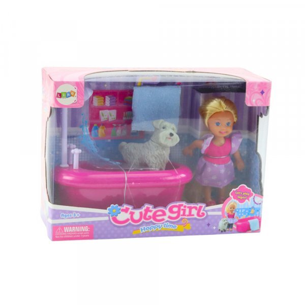 Lean Toys Mini Doll Set with Bathtub and White Dog Pink