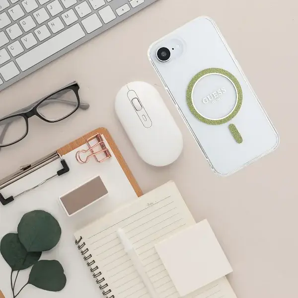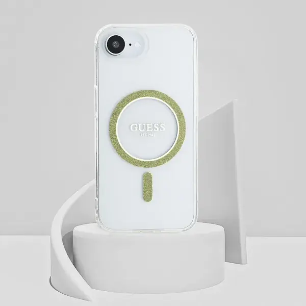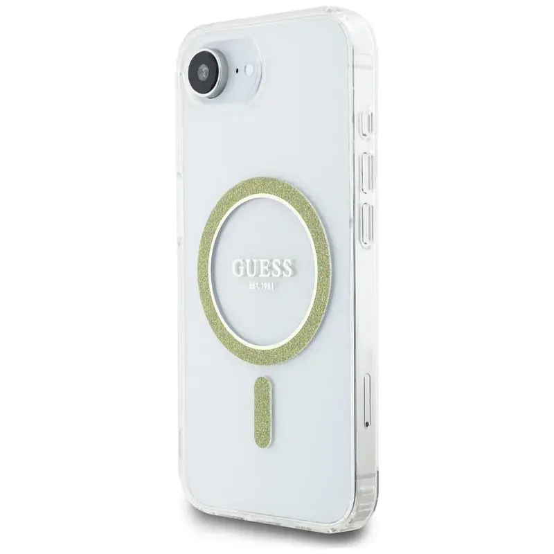 Mobiili lisaseade Guess Kaitseümbris IML Glitter Circle MagSafe iPhone 16e jaoks läbipaistev