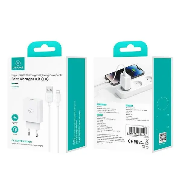 Mobiili lisaseade Usams 18W seinalaadija + Lightning/USB-A kiire laadimiskaabel valge/valge seeria SC SCXLTZ03