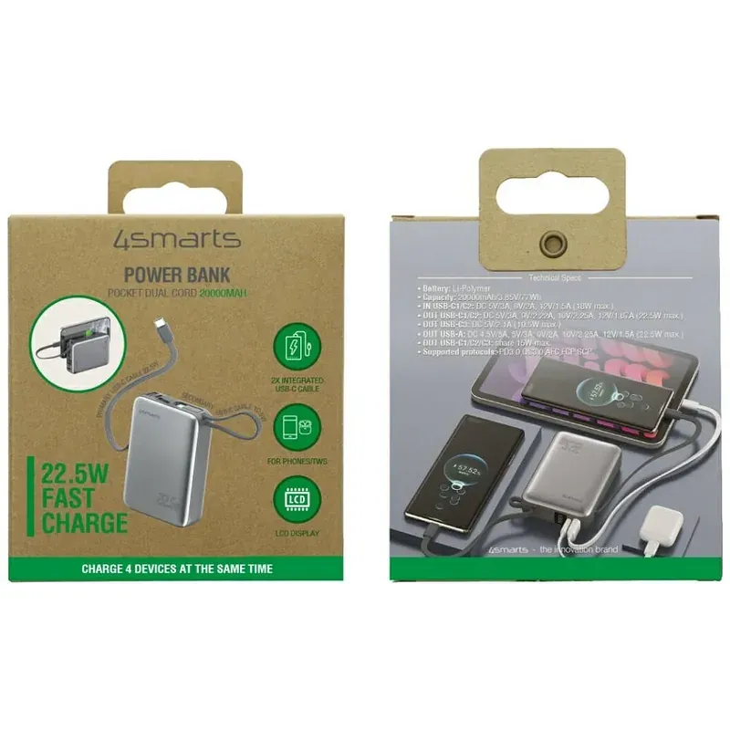 Akupank 4smarts Powerbank Pocket Dual Cord 20000mAh 22.5W sisseehitatud 15cm USB-C kaabliga hall