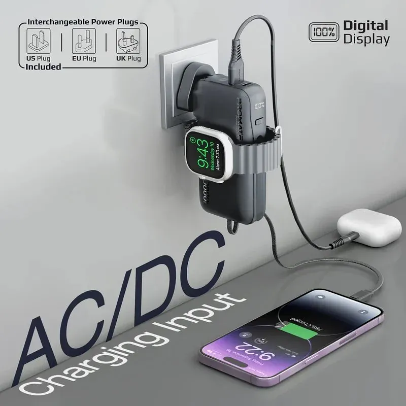 Akupank Promate PowerPack-10i Charger Power Bank 22W / 10000mAh / USB-C / QC3.0 / iWatch 2,5W / 220V EU/US/UK