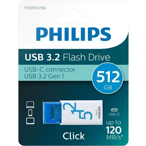 Väline mäluseade Philips USB-C 3.2 Gen 1 Flash Drive Click Ocean Blue 512GB