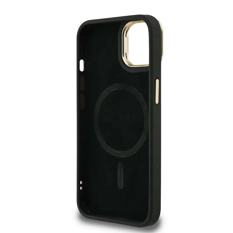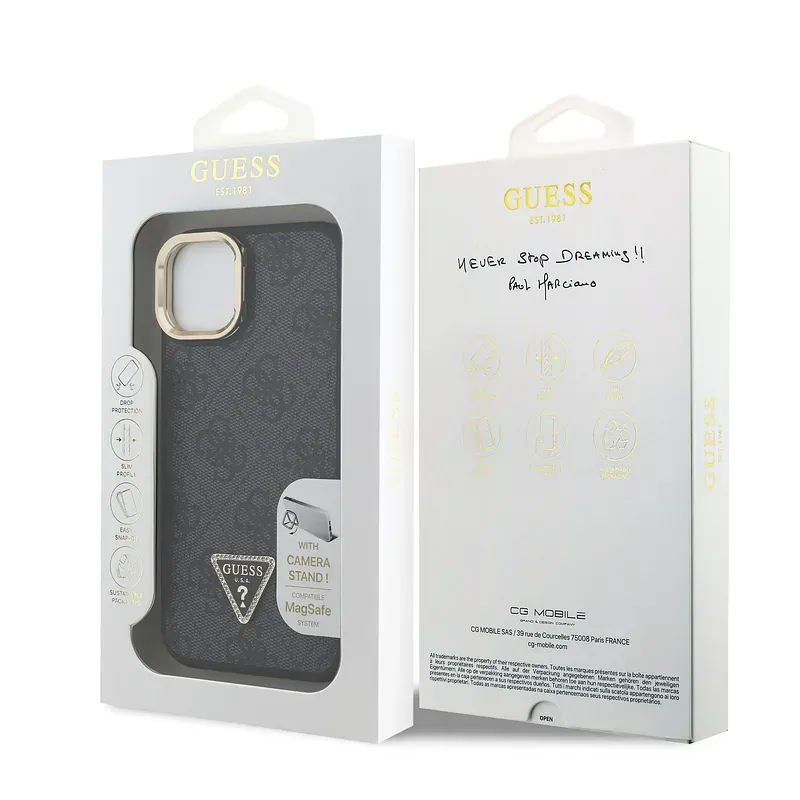 Mobiili lisaseade Guess PU 4G Strass Triangle Logo Stand Camera Frame MagSafe Case for iPhone 14 / Black