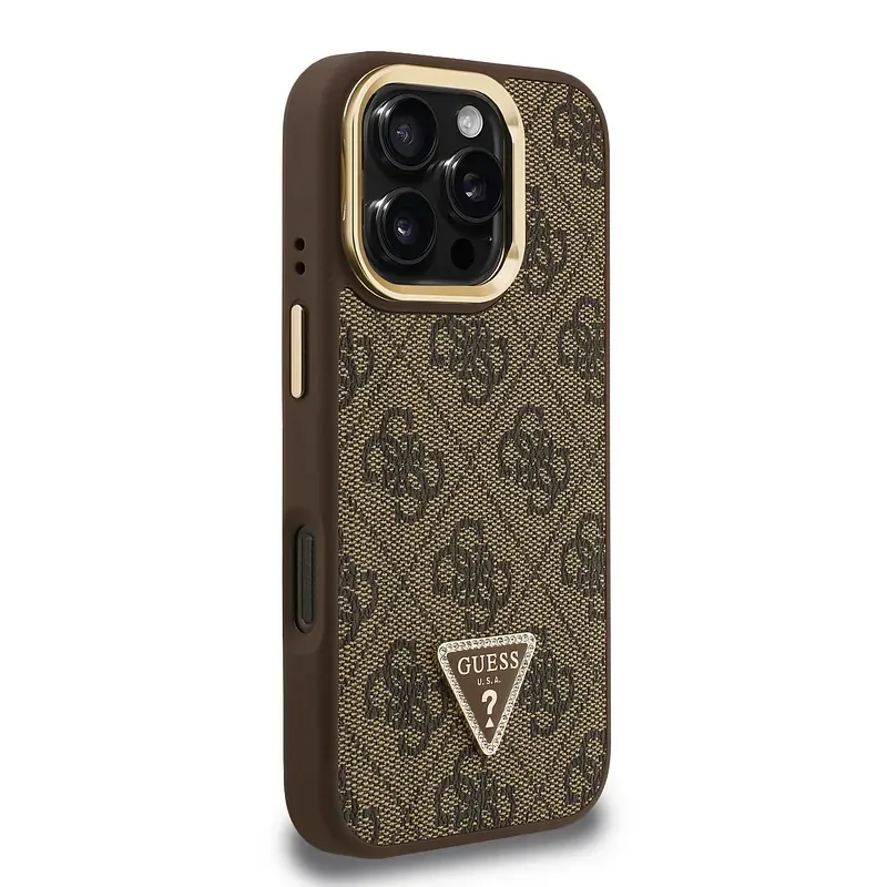 Mobiili lisaseade Guess PU 4G Strass Triangle Logo Stand Camera Frame MagSafe Case for iPhone 16 Pro / Brown