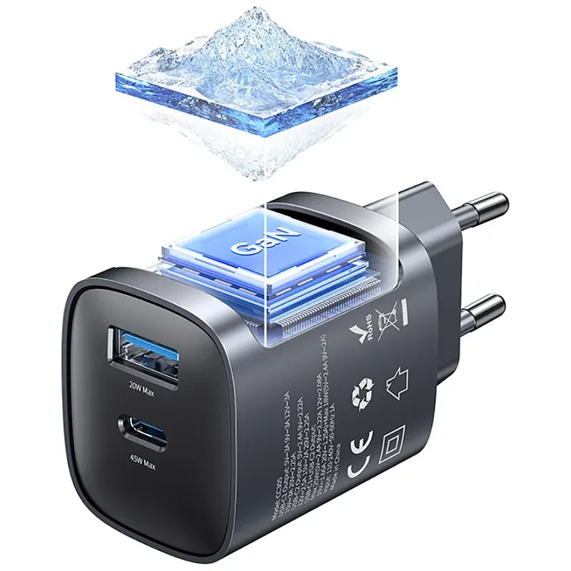 Mobiili lisaseade Usams Seinalaadija CC290 T66 45W GaN 1xUSB-A 1xUSB-C tumedam