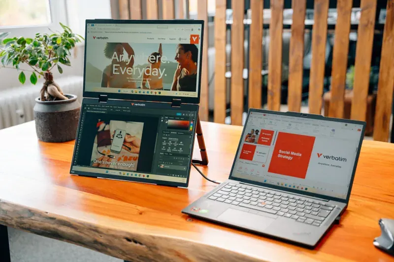 Kontoris, kodus või liikvel olles pakub Verbatim Portable 15.6” FHD Dual Monitor Essentials paindlikku ja kompaktset lahendust tööpinna laiendamiseks. Kahe vertikaalselt paigutatud ekraani ning mitme kuvarežiimi – Extend, Duplicate ja Ultra Mode – toega kohandub see erinevate töövoogudega. Õhuke ja kerge disain aitab suurendada tootlikkust ilma lisaruumi nõudmata. • Ülemise ekraani automaatne pööramine kokkupanekul • Kerge ja kaasaskantav, neopreenist kaitseümbrisega • USB-C ja Mini HDMI ühendus • Sobib multitasking’uks, esitlusteks ja kaugtööks