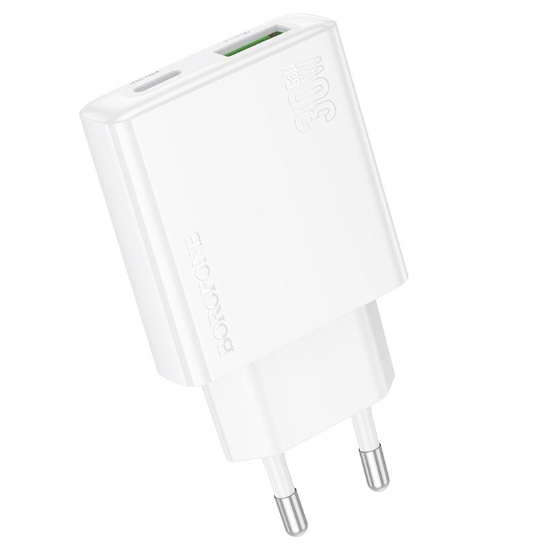 Mobiili lisaseade Borofone Wall laadija BN25 Wish (Ultra Thin) - USB + Type C - PD QC 3.0 30W valge
