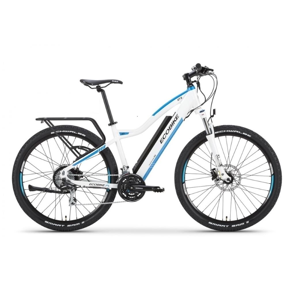 For many people, the real joy of cycling starts where the asphalt ends. MTB bicycle is the best vehicle for riding on not paved surface. They provide good traction on unstable ground and exhibit high durability in difficult conditions. And mountain bikes with electric support make the driving experience even more! The Ecobike mountain bike offer is opened by the "S" series. Presented S3 will appeal most to women and people with low growth through unique design and a small 17-inch frame. Ecobike S3 is a typical MTB design with electric drive of nominal power 350W. The engine located in the rear hub accelerates the bike up to 35 km/h after unlocking*. By placing the engine in the rear wheel, we gain better traction and greater stability. The new generation controller and Hall sensor are responsible for smooth acceleration without jerks. We control everything with the LCD display, which gathers a lot of useful information. The electric drive is powered by high quality batteries, assembled with the cells of Samsung, Panasonic or LG. Our bikes reach a range of 80 km to even 160 km with them. Located in the frame, they make an excellent center of gravity, which is particularly important in mountain bikes. Range of the batteries: - 36V 10,4 Samsung - 50-80 km - 36V 13Ah Samsung - 60-110 km - 36V 14,5 Ah Panasonic - 70-130 km - 36V 16Ah LG - 80-160 km *The bike is locked to the speed of 25 km/h, in accordance with the road traffic regulations. However, when exiting the public road, we can unlock it, using the display of the bike power in 100%, then our bike assists us up to 35 km/h! If we are too weak to pedal, we can use the gas trigger, which is not installed at the factory because of the current legislation, the customer can do it on its own (gas trigger attached to a bike). Weight 23,5 kg (aluminium) System LCD Panel - 6 modes of drive support with throttle to 32 km/h, speedometer with distance, and battery level Max. load 125 kg (including rack) Frame 17" Hydroformed alloy Wheel 27,5 inches, reinforced rims and stainless spokes Tires 27,5 x 2.10 Schwalbe Smart Sam Crank Shimano Acera Shifters front - Shimano Altus 3 speed rear - Shimano Acera 8 speed Suspension frontal SunTour XCM hydraulic Brakes hydraulic disk brake Shimano BL-M396L(L) BR-M395L(F) Grip Shimano Altus Handlebar PROMAX HB-3018 handlebar stem PROMAX BB parts VP-BC73C Hub MODUS Saddle VELO VL-1376 Package size 140 x 25 x 75 cm Bike size 190 x 62 x 120 cm