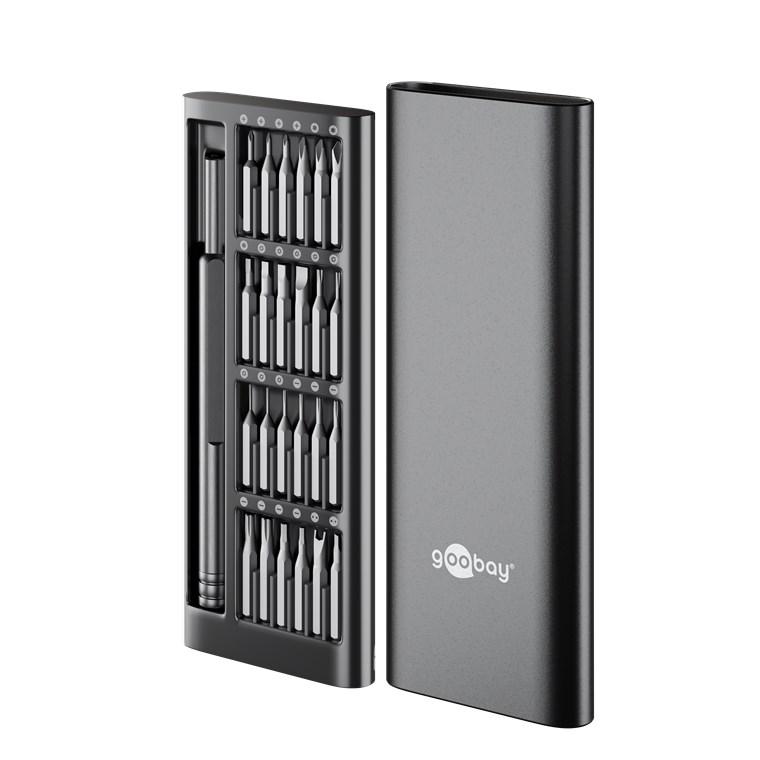 Kruvikeerajate komplekt 24 täppisotsikuga tööriistakomplekt S2 terasest, sobib täppiskeeramiseks, kokkupanekuks ja isetegemisprojektideksKvaliteet, mida tunned: Kruvikeerajate komplekt avaldab muljet mati alumiiniumkorpuse ja värvitud otsikuhoidjaga. Eriline omadus: karp avaneb pop-up mehhanismi abil. Erinevalt tavalistest hingedega karpidest ei purune siin lukustus ning karp püsib transpordi ja hoiustamise ajal kindlalt suletuna.Omadused: Kvaliteetne, kaetud alumiiniumist tööriistakomplekt praktilise pop-up avamismehhanismiga metallkarbis Ideaalne täppistöödeks elektroonikal, nt sülearvutitel, arvutitel, nutitelefonidel või droonidel, samuti kellassepatöödeks ja muuks peentööks Täppisotsikud läbimõõduga 4 mm ja pikkusega 28 mm, tüübimärgise ja visuaalse paigutusega karbis parema ülevaate tagamiseks Magnetiline otsikuhoidja kvaliteetsest metallist, pikkus 12,7 cm Komplektis olevad otsikud: 1× adapter 2.5 mm, 8× 6-kant tähekujuline (T, TH), 1× kolmnurkne (2.3), 6× ristpeaga (PH, P), 4× lapik, 1× kahar (spanner) 2.6, 2× tri-wing (0.6, 2.0), 1× puidupuur 2.5 Turvaline hoiustamine: Otsikud asuvad magnetiseeritud pesades, mis tagavad kindla paigalpüsimise ja hõlpsa eemaldamise.