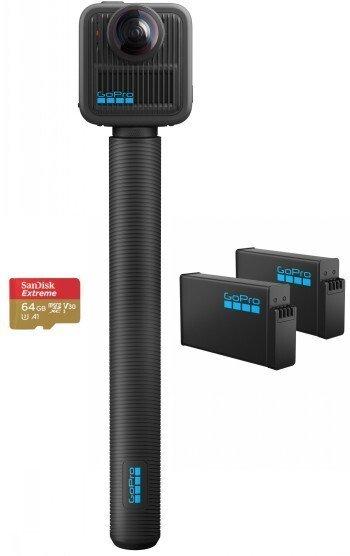 True 8K 360 videoMAX2 delivers True 8K, resulting in up to 21% more resolution than the competition. This means sharper detail and unmatched image quality you only get from GoPro.MAX2 never misses360 video captures everything around you—just record and pick the best angles later in the app. You never have to aim, but always get the shot.Get the shot, not the poleCapture those incredible invisible selfies, third-person drone-like footage and more iconic 360 shots.The only 360 cam built for thisMAX2 is the toughest, most versatile 360 camera because it's a GoPro. It thrives in high speeds, water, dirt, snow, and is built to perform in any environment.Twist-and-go replaceable lensesMAX2 replaceable lenses are made from super-strong optical glass, making them tough and difficult to break. And if they ever do get damaged, you won’t have to replace the entire camera—just swap lenses and get back to the action.The best POV, period Get wide-as-you-want POV for the most thrilling + immersive shots Capture POV + 360 at the same time, so you can explore more angles later in the app Adjustable video stabilization + Horizon Lock Super Slo-Mo in 360Slow the action way down with amazing 4K100 spherical video (that’s 3X slo-mo). Or go with a higher-resolution 5.6K60—up to 2X slow motion.10-bit color in 8K + 300 Mbps + GP-LogCapture over 1 billion colors in 8K, delivering a more realistic image with true-to-the-eye colors, and up to 300Mbps bitrate with GoPro Labs—the highest on any consumer 360 camera. And pro-users can use GP-Log Encoding with LUT.Epic 29 MP 360° photosGet ultra high-res 360° photos and legendary GoPro point-of-view shots. You’ll have the flexibility to crop, zoom and Reframe for the exact look you want in the Quik app.Turn 360 footage into rad videos from the cloudEditing 360 footage is called Reframing, and the creative possibilities are endless. It’s super easy to pick the shots you want. Then track objects, add dynamic movements and transitions, even use multiple Reframe modes in the same clip—all with just a few taps.Object trackingEffortlessly follow and focus on subjects anywhere around the camera.Freestyle your editsWith MotionFrame, simply move your phone within 360 footage to find the best angles.KeyframesEasily select your field of view at specific moments in time, and transitions are automatically generated between them.CameraFXMake your videos more exhilarating than ever with CameraFX. These let you easily add pro-level motion with effects like Spin, Flip, Roll, Wobble, Tiny Planet and more.Easy POV + selfie modesThe easiest way to get GoPro’s world-famous, immersive POV and selfies. The camera automatically shows you a front-facing 180° view, or the reverse angle for an awesome third-person selfie.**But MAX never misses—you still capture in 360 when shooting in these modes, so you can explore all the angles.Shoot for Youtube + TikTok at the same timeShooting 360 enables you to grab any aspect ratio from any shot. You get the best vertical capture and the best widescreen capture without changing any mounting setups.180° in 4K60Get super wide, immersive POV shots from the front or back lens with the Max HyperView digital lens. It delivers a 180° field of view in stunning 4K60. 4 other digital lenses are available with 4K60, too—Linear, Wide, Ultra Wide and Max SuperView.Say goodbye to shaky videosMax HyperSmooth is GoPro's most powerful video stabilization, delivering maximum smoothness in the roughest conditions. And 360 Horizon Lock keeps all your shots level, whether you’re spinning, flipping or chasing your kids.Cold-weather Enduro battery includedThis long-lasting battery boosts performance in cold temps so you can record longer, and with confidence.Immersive audio + precise controlWhen shooting 360, the 6-microphone array captures clean stereo audio from all around you + reduces wind noise for the best sound quality ever in a GoPro. In Single Lens Mode, you can automatically match stereo audio width to your video field of view, or manually select Front, Back, or Match Lens options for precise control over where your audio is captured.360 night effectsGet creative after dark with 360° Star Trails, Light Painting + Vehicle Light Trails, which create beautiful spherical videos with moving light.Time lapse + night lapseDay or night, shrink time with long-duration 360° time lapse videos in up to 8K.Stunning 8K Max TimeWarpCapture silky-smooth, super-thrilling 360° TimeWarp videos in glorious 8K, then Reframe in any direction for truly unique perspectives.Scheduled CaptureWith Scheduled Capture, your MAX2 turns itself on and automatically captures a shot up to 24 hours in advance.Timecode syncWirelessly synchronize multiple MAX2s via timecode in the Quik app. It’s perfect for when you want to capture an activity from multiple angles and then make precise, match-frame edits in post-production. Use matching timecode clips in Adobe Premiere Pro and other applications that support multi-camera editing for your next project.Bluetooth audio + voice controlUse Apple AirPods, Bluetooth earbuds or other wireless mics during interviews or narration. You can also give voice commands remotely and hear alerts from your camera.Accessories Bundle includes: MAX2 Camera 4ft (1.2m) Extension Pole Protective Lens Caps (2x) Enduro Battery (2x) Curved Adhesive Mount Thumb Screw (2x) Microfiber Lens Cloth USB-C Cable Mounting Finger Adapter Mounting Buckle Wrist Lanyard SanDisk Extreme® 64GB microSDXC™ Stickers (4x)