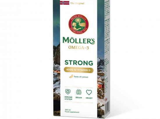Päevane annus tagab kuni 2200 mg Norra oomega-3-rasvhappeid ja kuni 4000 IU D-vitamiini. Norra oomega-3 ja D-vitamiini koostis on loodud toetama immuunsüsteemi, südame, luude, lihaste ja aju talitlust. Miks valida „Möller´s Strong Vitamin D”? Kõrge oomega-3 sisaldus – päevane annus sisaldab kuni 2200 mg oomega-3-rasvhappeid (EPA ja DHA). Väga suur D-vitamiini kogus – kuni 4000 IU (100 µg) ühes annuses. Aitab hoida immuunsüsteemi normaalset talitlust, lihaste funktsiooni ning luude ja hammaste tervist. Triglütseriidide vorm – tagab oomega-3 parem imendumise organismis. Ilma kalamaitseta – värske sidrunimaitse muudab kalaõli tarvitamise meeldivaks; Rangelt kontrollitud kvaliteet ja puhtus – „Möller´si“ tursa maksast saadud õli kvaliteeti jälgitakse kogu tootmisprotsessi vältel ning seejärel testitakse sõltumatutes laborites, kus kontrollitakse enam kui 150 erineva aine sisaldust, et tagada toodete pikaajaline kvaliteet, puhtus ja ohutus; Püütud ja toodetud Norras – tursapüük toimub puhtas Põhja-Norra vetes ning tooraine töödeldakse värskuse ja kvaliteedi säilitamiseks esimese 24 tunni jooksul pärast püüki. Toode on valmistatud vastavalt Norra kvaliteedi- ja värskusenõuetele.