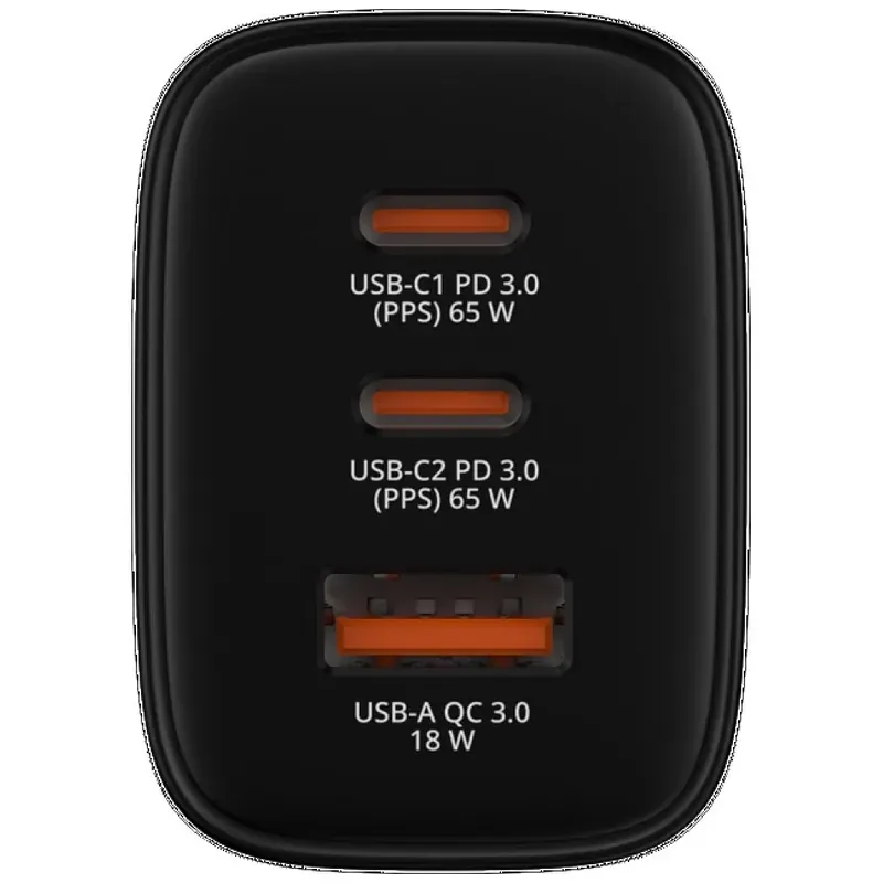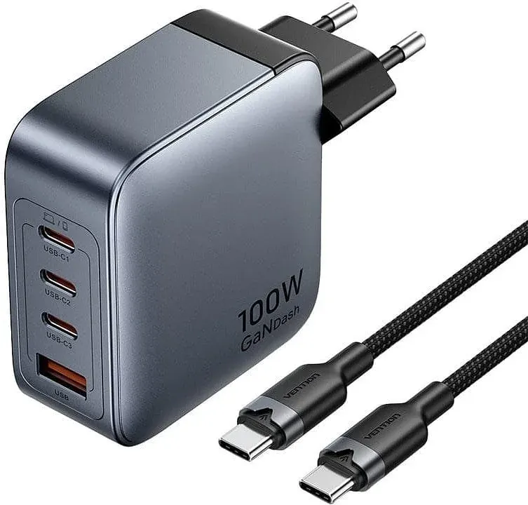 Vention 3x USB-C, 1x USB-A, (100W/100W/30W/30W) mains charger (gray) with USB-C to USB-C cable (1m) (black)The Vention TZ-FET-EU is a mains charger that uses GaN V technology to achieve up to 100 watts of power with reduced device dimensions. Compared to a standard 96W charger, it is up to 20% smaller. It can quickly charge devices such as the MacBook Pro (36% in 30 minutes), iPhone 16 Pro (54%), iPad Pro (45%) and Samsung S24 Ultra (65%). It comes with a heavy-duty USB-C to USB-C cable with a length of 1m and a maximum power output of 100 watts.Smart power distributionThe device features four ports - 3x USB-C and one USB-A, allowing you to charge your laptop, smartphone, tablet and headphones simultaneously. The maximum power of a single USB-C port (C1/C2) is 100 watts, while the C3 and USB-A ports offer up to 30 watts. Thanks to PD 3.0 and PPS technology, the charger automatically adjusts parameters to the connected equipment. For example - with a full load of four ports, the power distribution is as follows: 40 W + 18 W + 9 W + 9 W.Safety of useThe charger uses 9 protections, including overvoltage, overcurrent, overload, short circuit, overheating, electromagnetic interference and lightning. The temperature control system allows safe use around the clock. GeneralManufacturerVentionName100W GaN Charging KitModelTZ-FET-EU ChargerPortsUSB-A / USB-C ×3MaterialPCInput110-240 V ~ 50/60 Hz, 3A max.Output (USB-C1 / C2)5V⎓3A; 9V⎓3A; 12V⎓3A; 15V⎓3A; 20V⎓5A (100W max.).Output (USB-C3)5V⎓3A; 9V⎓3A; 12V⎓2.5A (30W max.).Output (USB-A)5V⎓3A; 9V⎓3A; 12V⎓2.5A (30W max.).Total output power100W max. CableConnectorUSB-CRated current5A max.Rated power100W max.Data transfer speed480 MbpsOuter diameter3.8 mmLength1 m