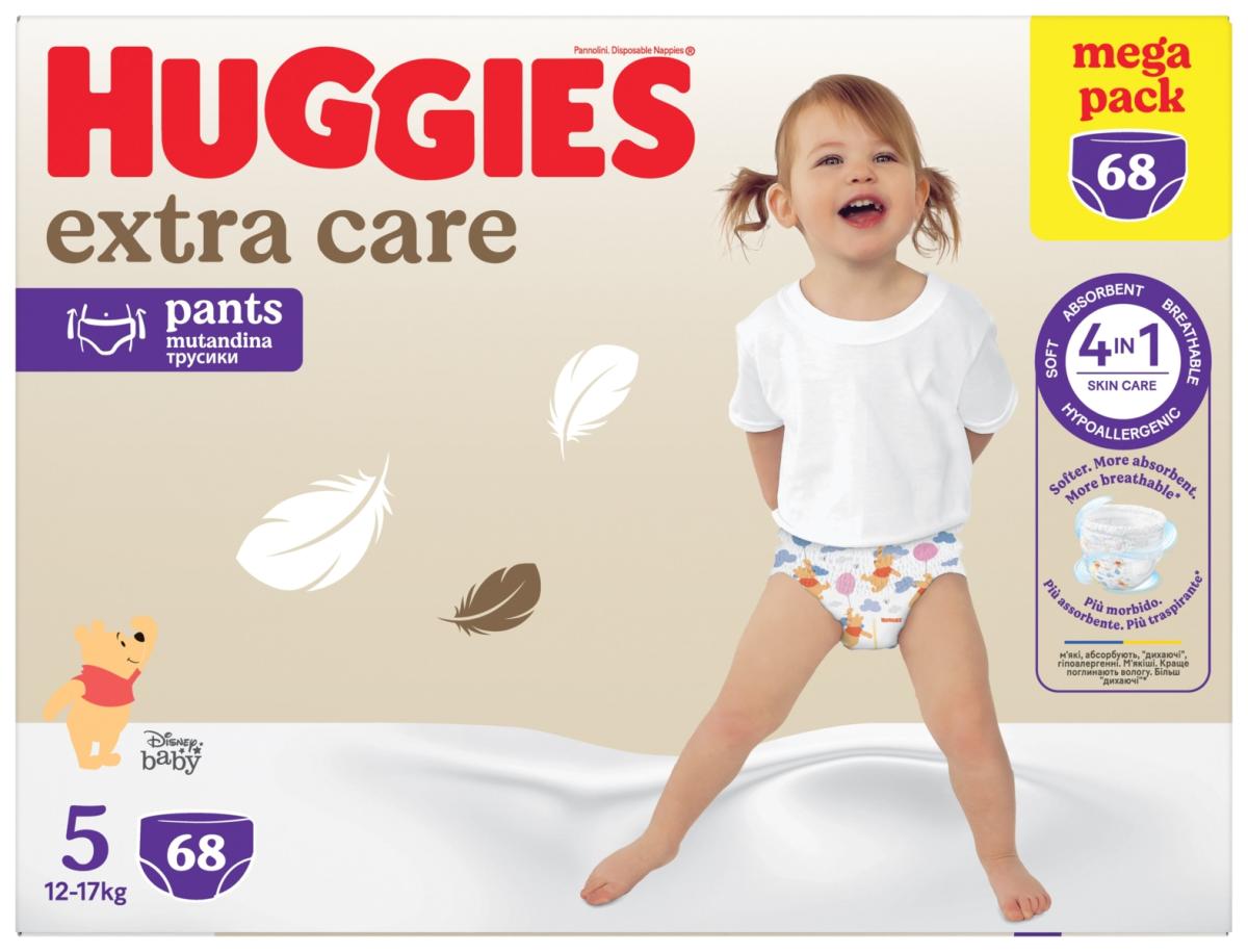 Huggies® Extra Care püksmähkmed on spetsiaalselt loodude beebide tundlikule nahale, mis on 3 korda õhem ja tundlikum kui täiskasvanute nahk. Huggies® Extra Care on dermatoloogide poolt heaks kiidetud ja hüpoallergeenne, mis sobib ärritusele kalduvale nahale. Omadused:2 spetsiaalset imendumistsooni veelgi paremaks nahakaitseks: pehmed imavad padjad ees ja vedela väljaheite tsoon tagaküljel.Äärmiselt pehmed ja nahasõbralikud materjalid.Pakub neli-ühes nahahooldust: pehme, imav, hingav, hüpoallergeenne.Poorsed materjalid võimaldavad nahal hingata.Kõrged säärekaitsmed.Pehme elastne vöökoht, mis aitab vältida lapse tundliku naha punetust.Sobivad poistele ja tüdrukutele.Lihtne jalga panna ja ära võtta, külgi lahti rebides.Armas Disney® kujundus.Kanalid takistavad vajumist ja pundumist.2 pakki 34 tükki pakis, kokku 68 mähet.Suurus: 5 (12-17 kg)