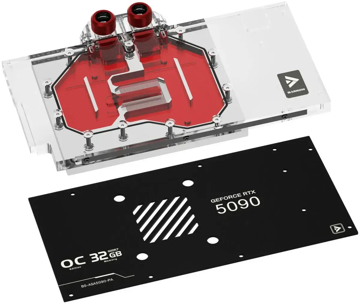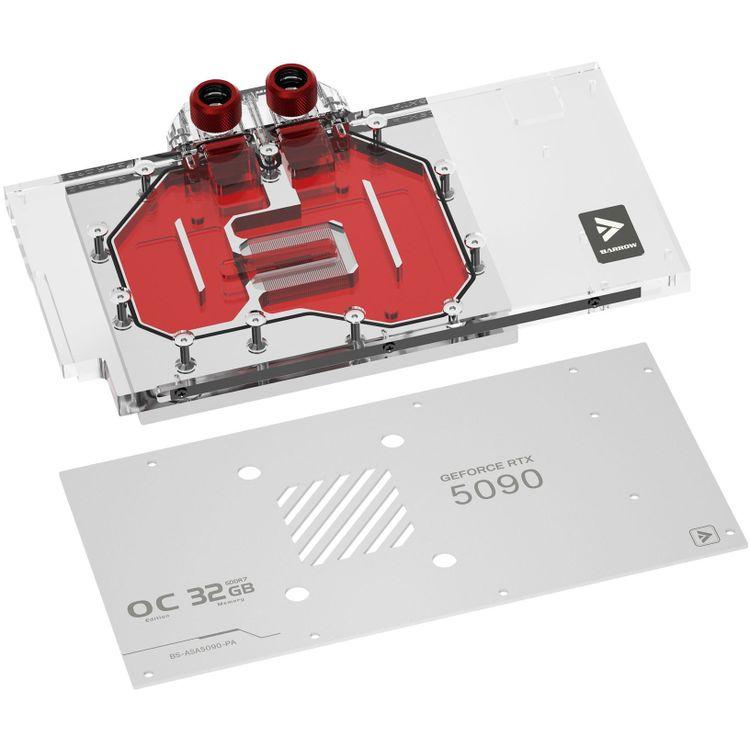 GPU water cooler for ASUS ROG ASTRAL-5090 graphics cards, with backplate and RGB lighting Precisely tailored to ASUS ROG ASTRAL GeForce RTX 5090 graphics cards Striking appearance with a transparent design G1/4-inch fittings for easy loop integration Backplate included Addressable RGB lighting Barrow ASUS ROG Astral Geforce RTX 5090: Powerful GPU Block The Barrow ASUS ROG Astral Geforce RTX 5090 full-cover water cooler is a high-quality GPU block for custom water cooling systems, designed to fit the PCB layout of ASUS ROG ASTRAL-5090 graphics cards. The copper base ensures efficient cooling for the GPU, memory, and voltage regulators. With its elegant transparent design and integrated RGB lighting, this block delivers both performance and style. Cooling Performance Meets Design This GPU water block covers all critical components, providing effective cooling. Nickel-plated copper maximizes heat transfer for excellent performance, even under demanding loads. The top is made of transparent acrylic, featuring integrated RGB lighting. The included black aluminum backplate also assists with heat dissipation. G1/4-inch connectors ensure straightforward integration into your water cooling loop. Note: This GPU block is only compatible with the following graphics cards: ASUS ROG ASTRAL LC Strix RTX5090 D 32G GAMING ASUS ROG ASTRAL Strix RTX5090 D 32G GAMING