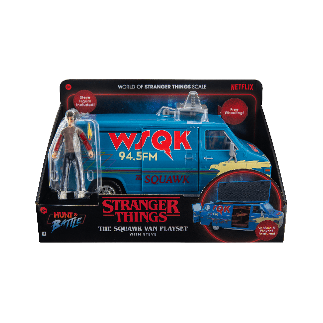 Elusta Stranger Things maailm Steve´i SQWK kaubiku ja aksessuaaride mängukomplektiga. Detailne kaubik pakub valgus- ja heliefekte, ülespoole avatavat katust ning interaktiivseid elemente, nagu välja libisev tööriistasahtel ja “Portal Pull” vintsi funktsioon. Komplektis on 10 cm Steve´i figuur ja mitmed aksessuaarid, ning autosse mahub korraga mitu tegelast – ideaalne fännidele ja kollektsionääridele.