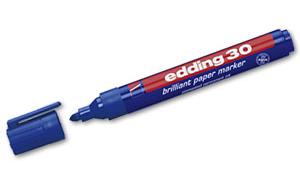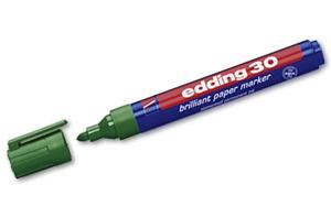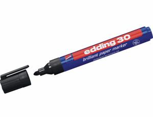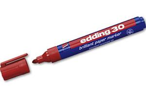 Edding 30 - paberimarker Veekindel marker on tugevas plastikust korpuses. Markeril on praktiline kork, mis ei veere kaldus pinnalt maha ja mida saab kinnitada näiteks riiete külge. Sobib ideaalselt kirjutamiseks paberile, papile ja kartongile. Briljantne tint on kiiresti kuivav, vee- ja kuumakindel ning ei imbu läbi paberi. Markeri ümar ots võimaldab tõmmata joont laiusega 1,5-3 mm. Värvid on erksad ja ei tuhmu ajaga. Toodetud Saksamaal.