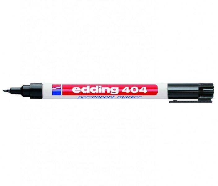 Edding 404 - veekindel marker Veekindel marker on tugevas plastikust korpuses. Markeril on praktiline kork, mis ei veere kaldus pinnalt maha ja mida saab kinnitada näiteks riiete külge. Sobib ideaalselt kirjutamiseks metallile (ei pea eelnevalt puhastama), kartongile ja paberile. Saab kasutada ka sellistel pindadel nagu puit (ka märg), klaas, plastik, keraamika, kiled. Markeri ümar ots võimaldab tõmmata eriti peenikest joont laiusega 0,75mm. Värvid on erksad ja ei tuhmu ajaga. Toodetud Saksamaal.