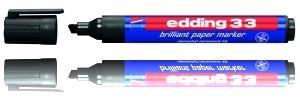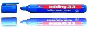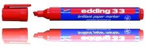 Edding 33 - paberimarker Veekindel marker on tugevas plastikust korpuses. Markeril on praktiline kork, mis ei veere kaldus pinnalt maha ja mida saab kinnitada näiteks riiete külge. Sobib ideaalselt kirjutamiseks paberile, papile ja kartongile. Briljantne tint on kiiresti kuivav, vee- ja kuumakindel ning ei imbu läbi paberi. Markeri lõigatud ots võimaldab tõmmata joont laiusega 1,5-3 mm. Värvid on erksad ja ei tuhmu ajaga. Toodetud Saksamaal.