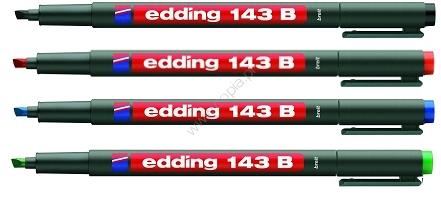 Edding 143 B - permanentne kilemarker Marker sobib kirjutamiseks mittepoorsetele plastikust läbipaistvatele pindadele. Markeeringut saab hiljem korrigeerida alkoholiga niisutatud lapi abil. Lõigatud otsaga markeri joone jämedus on 1-3mm. Markeri tint on veekindel ja kuivab kiiresti. Toodetud Saksamaal