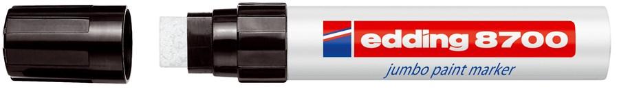Edding 8700 - JUMBO suuruses lakimarker Läikiva tindiga marker on permanentne ja määrdumiskindel. Saab kirjutada siledatele pindadele nagu klaas, metall ja libeda pinnaga paber. Sobib ka tumedatele ja läbipaistvatele pindadele, kuna tint on pindadel läbipaistmatu. Värvilaadne tint on kiiresti kuivav, ilmastiku- ja kulumiskindel. Pindu ei pea enne kirjutamist puhastama. Marker on metallist korpusega ja sellega saab teha eriti suurt 5-18mm paksusega kirja. Kasutamiseks loksutada ja markeri otsa pumbata, kuni otsik värvub tindiga. Ideaalne kaunistamiseks - sobib ka klaasile vitraažide tegemiseks.