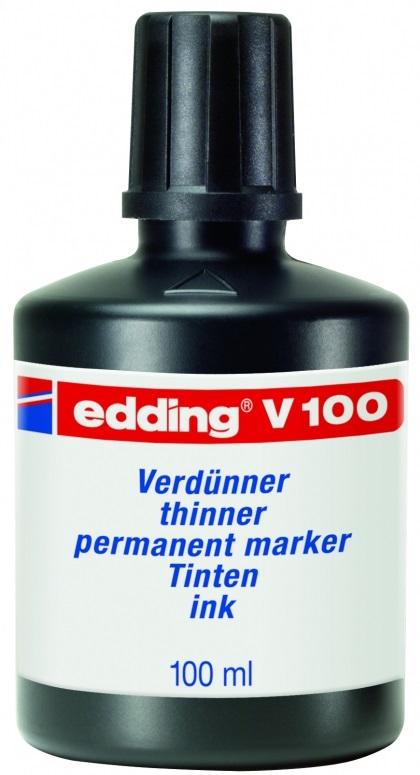 Edding V100 - markeritindi lahusti Sobib T25, T100 ja T1000 täitetintide lahustamiseks, värvi heledamaks muutmiseks ja tindiplekkide eemaldamiseks erinevatelt materjalidelt. Sellega saab edukalt eemaldada ka permanent markerit valgetahvlilt. Toodetud Saksamaal. 1L hind 60,50€