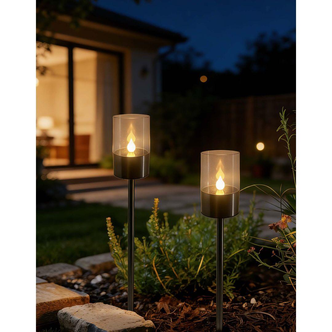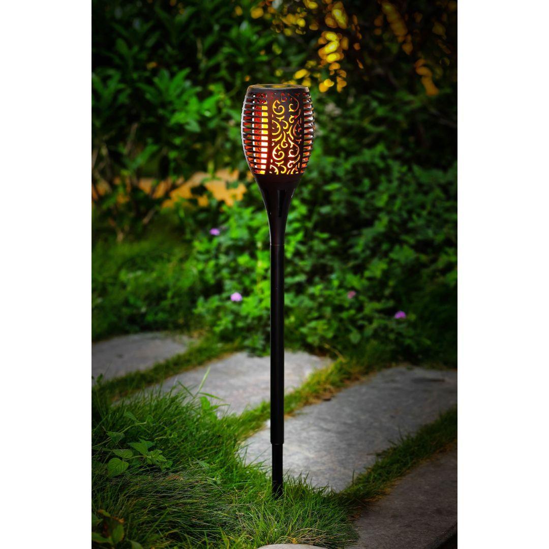 Solar aiavalgusti mõõtmed on 5,5 x 5,5 x 36,5 cm. Valgusti on valmistatud plastikust ja sellel on 6 sooja valge valgusega LED-i. Valgusefekt on leegiefekt. Kasutusel on amorfne päikesepaneel. Komplektis on 1 x 1,2 V 2/3 AAA 100 mAh aku.