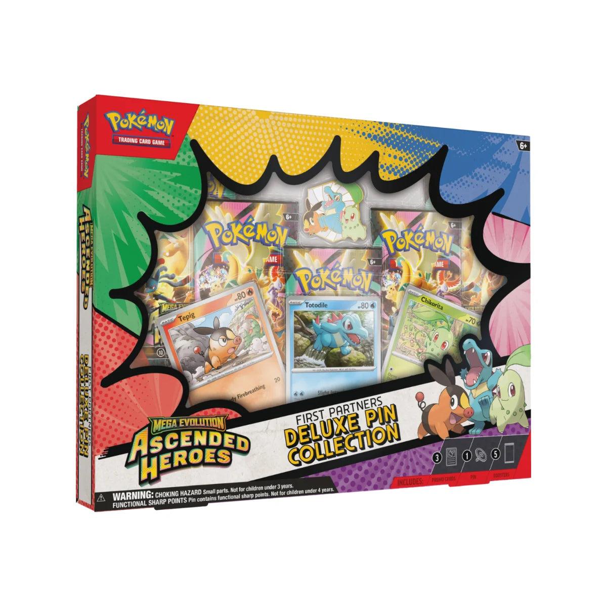 Before going on a new adventure, it’s essential to choose a first partner Pokémon! With this box, you can befriend the Grass type Chikorita, the Fire type Tepig, and the Water type Totodile as foil promo cards and as a deluxe pin showing off all three Pokémon together in glossy enamel. You also get five booster packs from the Mega Evolution—Ascended Heroes expansion.