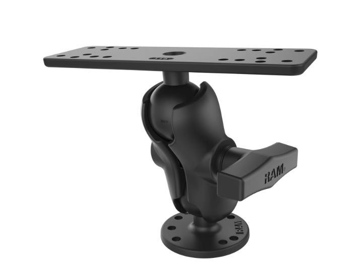 The RAM-D-111U-C consists of a short double socket arm, 3.68" diameter round base, and 11" x 3" rectangle base. The round base includes a 2.25" D size rubber ball and contains pre-drilled holes, including the universal AMPS hole pattern. The rectangle base also includes a 2.25" D size rubber ball and contains a variety of pre-drilled holes that are compatible with several large marine electronic devices, including fishfinders and chartplotters.
