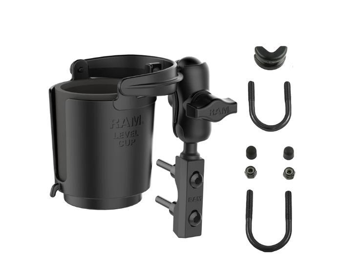 The RAM-B-132RU consists of a zinc-coated U-bolt base, medium length double socket arm, and the RAM® Level Cup™ self-leveling drink holder with koozie. Included in this kit is U-bolt hardware that will accommodate rails from 0.5" to 1.25" in diameter and black cover caps to be placed over the exposed ends of the U-bolt. The RAM® Level Cup™ has two pivot points so your drink always stays upright and never spills. The integrated eyelet and hook provide an optional tethering function, allowing you to secure any small or open container in demanding environments. Compatible with cups, cans, bottles, and mugs ranging from 2.5” to 3.5” in diameter.