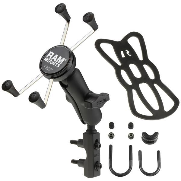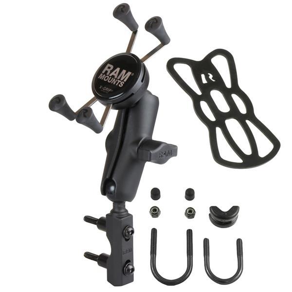 The RAM-B-174-UN7 consists of hardware for mounting to either brake/clutch reservoirs and rails that are 0.5" to 1.25" in diameter, double socket arm and universal X-Grip® cell phone cradle. Designed into the mount is a 1" diameter patented rubber ball and socket system with adjustment points at both ends of the socket arm; this with a twist of the arm knob, allows you to move the X-Grip® mount to your optimum viewing position. The mounting hardware for brake/clutch reservoirs include both standard and metric mounting bolts. The included X-Grip® cradle has a clean and clever four leg design that sports great holding power without hiding your phone behind foam pads and plastic. The spring loaded X-Grip® cradle expands and contracts, allowing for a perfect custom fit of your cell phone. The perfect complement to the modern sleek interior of today's vehicles, the RAM X-Grip® is the cell phone cradle evolved.The X-Grip® includes a device tether recommended for outdoor applications. The cradle is compatible with handheld devices that will fit the dimensions listed below. It is important to verify the dimensions of your handheld device with a case/sleeve/skin when determining the overall size.Cradle DimensionsMinimum Width = 1.875" (Minimum Height = 4.25")Maximum Width = 3.25" (Minimum Height = 2.25")Depth = 0.875"