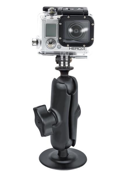 The RAM-B-166-A-GOP1U consists of a 3.3" diameter suction cup twist lock base, SHORT length double socket arm and 1" diameter ball with custom GoPro® Hero adapter. The mount is designed with a RAM 1" diameter patented rubber ball and socket system that has adjustment points at both ends of the double socket arm; this allowing for almost infinite adjustment and perfect viewing angles. The suction cup, twist lock base is designed to have a strong hold on glass and non-porous plastic surfaces, including adhesive disks. The GoPro® Hero adapter attaches directly to the underside of the camera, replacing the factory mounting bracket.