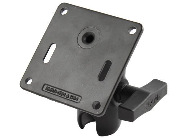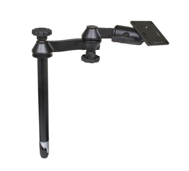 The RAM-VP-SW1-12-2461 consists of a 12" upper male Tele-Pole™, double swing arm and 3.625" square base that contains the VESA hole pattern. The Tele-Pole™ can be easily adjusted by turning the knob at the top of the post. Once the knob has been tightened, the Tele-Pole™ becomes a rigid support for connecting devices or cradles. The Tele-Pole™ will connect to any RAM vehicle base with a welded female Tele-Pole™. The double swing arm with rotating plate, allows you to twist and tilt the viewing angle of your connected electronic device, when mounted on your RAM Vehicle Mount. The rotating swivel arm gives you even more viewing positions for your mounted electronic device while holding everything firmly in place. The length of the double swing arm is 12". The 3.625" square base includes a 75mm X 75mm VESA hole pattern with 1.5" rubber ball positioned 0.88" from the center of one edge.