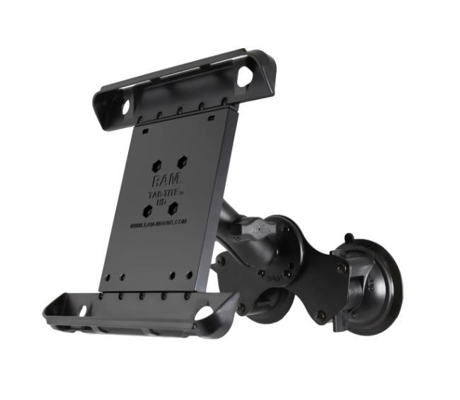 The RAM-B-189-TAB3U consists of a double 3.3" twist lock suction cup base, double socket arm, round base adapter and Tab-Tite™ universal clamping cradle. The suction cup base is designed to have a strong hold on glass and non-porous plastic surfaces. The mount is designed with a RAM 1" diameter patented rubber ball and socket system that has adjustment points at both ends of the double socket arm; this allowing for almost infinite adjustment and perfect viewing angles. The spring loaded Tab-Tite™ cradle makes it easy to load and unload your tablet, along with keeping it secure while on the go. Interchangeable cup ends are designed to optimize the functionality of your tablet, allowing access to audio jacks, usb, power, and other ports, your tablet can be used just as it was intended. The Tab-Tite™ cradle is compatible with any tablet that will fit the dimensions listed below. It is important to verify the dimensions of your tablet when determining the overall size.