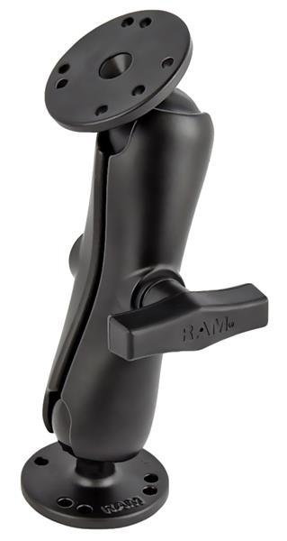 The RAM-101 consists of a double socket arm and two 2.5" diameter round bases that contain the universal AMPS hole pattern. The mount is designed with a 1.5" diameter patented rubber ball and socket system that has adjustment points at both ends of the double socket arm; this allowing for almost infinite adjustment and perfect viewing angles.