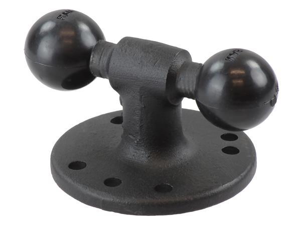 The RAM-B-217U consists of two 1" diameter rubber balls connected to a post and 2.5" diameter round base. The round base has pre-drilled holes, including the universal AMPs hole pattern and 3-hole 120 degree pattern. The 1" balls measure center to center 2.5" apart.