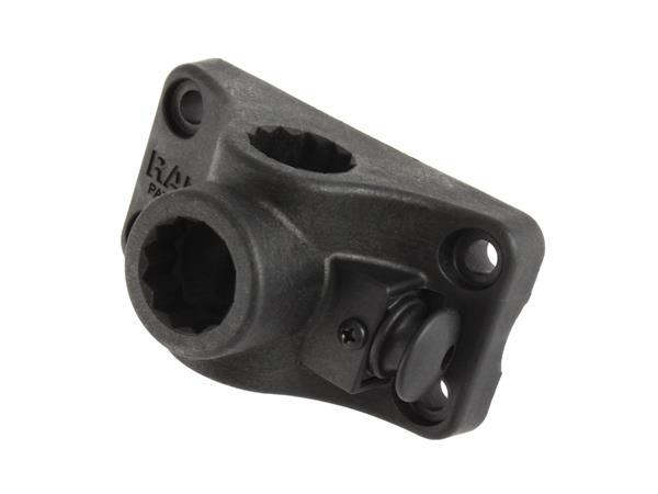 The combination bulkhead/flat surface mounting base can be installed on a flat surface such as the deck or on a vertical surface. This mounting base features a locking feature which requires the release of a plunger to remove the rod holder. Compatible with RAM post and spline rod holders and RAM wedge mount ball adapters.
