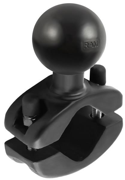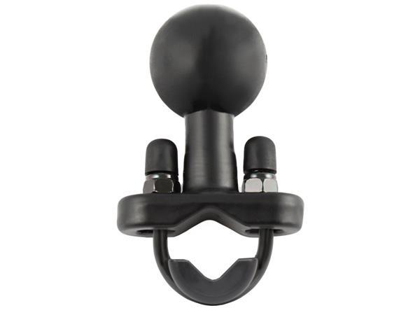 The RAM motorcycle handlebar base contains a 1.5" rubber ball designed to sit at right angles to the mounting rail. The "Rust-Proof" stainless steel u-bolt accommodates rails in diameter from 0.5" to 1" in diameter. Included are black cover caps to be placed over the exposed ends of the u-bolt and a composite adapter that can narrow the rail to a minimum width of 0.5".