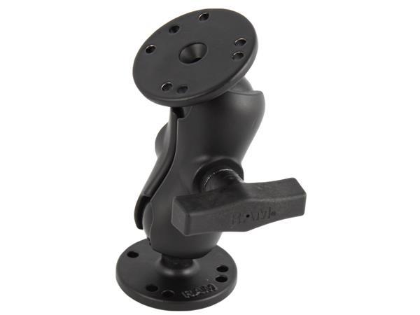 The RAM-B-101U-A consists of a SHORT double socket arm and two 2.5" diameter round bases that contain the universal AMPS hole pattern. The mount is designed with a 1" diameter patented rubber ball and socket system that has adjustment points at both ends of the double socket arm; this allowing for almost infinite adjustment and perfect viewing angles. The hole pattern found on the round base adapter will connect to many RAM cradles, including all iPad cradles. The included RAM’s patented design dampens shock and vibration, helping to extend the life of your device.