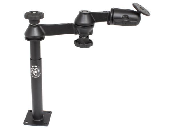 The RAM-VP-SW1-89 consists of a 9" lower female Tele-Pole™, 8" upper male Tele-Pole™, double swing arm and 2.5" round base that contains the universal AMPs hole pattern. The lower female Tele-Pole™ will attach to all RAM vehicles bases that do not contain a welded female Tele-Pole™. The height of the Tele-Poles™, combined, can easily be adjusted by turning the knob at the top of the post. Once the knob has been tightened, the Tele-Pole™ becomes a rigid support for connecting devices or cradles. The double swing arm allows you to twist and tilt the viewing angle of your connected electronic device, when mounted on your RAM Vehicle Mount. The rotating swivel arm gives you even more viewing positions for your mounted electronic device while holding everything firmly in place. The length of the double swing arm is 12".