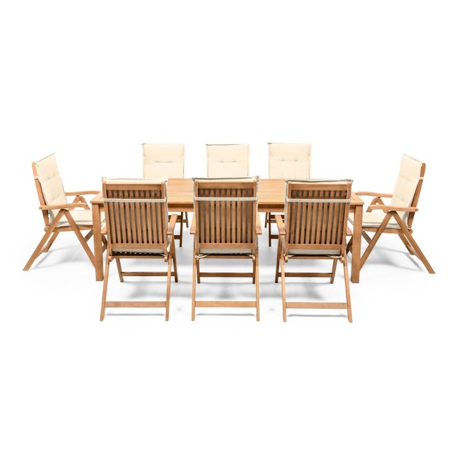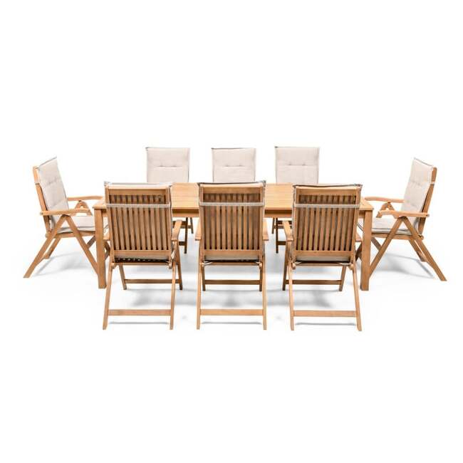 | BIGBOX.EE | "Familis" aiakomplekt: laud 240 cm + 8 tooli reguleeritava seljatoega ja kreemikat värvi padjadega, eukalüptpuu. Välimööbli komplektid | 882,57 € | Poodi | ||