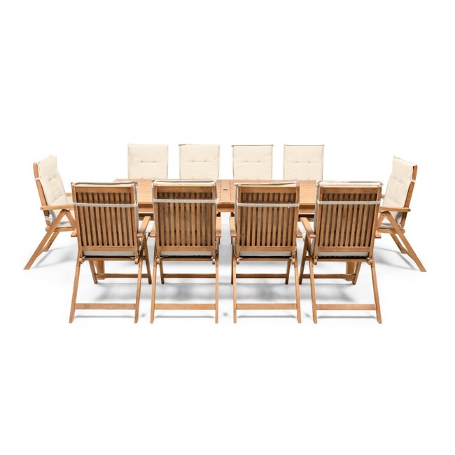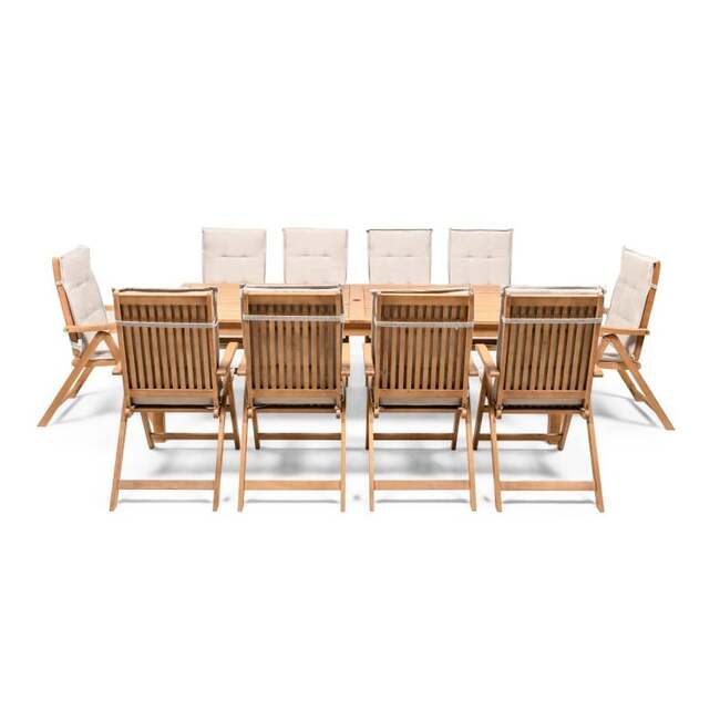 | BIGBOX.EE | "Familis" aiakomplekt: laud 240 cm + 10 tooli reguleeritava seljatoega ja kreemikat värvi padjadega, eukalüptpuu. Välimööbli komplektid | 1053,67 € | Poodi | ||
