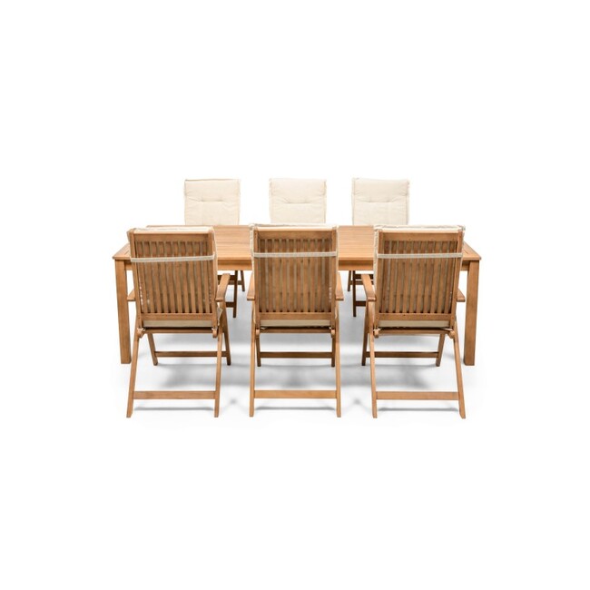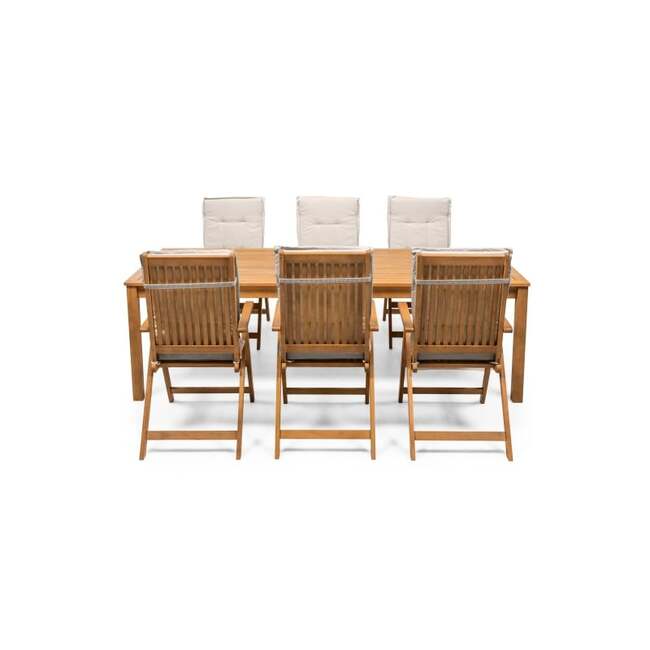 | BIGBOX.EE | "Familis" aiakomplekt: laud 240 cm + 6 tooli reguleeritava seljatoega ja kreemikat värvi padjadega, eukalüptpuu. Välimööbli komplektid | 711,48 € | Poodi | ||