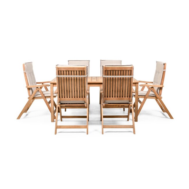 | BIGBOX.EE | "Familis" aiakomplekt: laud 160 cm + 6 tooli reguleeritava seljatoega ja kreemikat värvi padjadega, eukalüptpuu. Välimööbli komplektid | 670,82 € | Poodi | ||