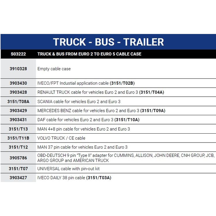 (EN) Diagnostic cables set, testri mudel: DS150E/DS180E, tootja DAF, MAN, SCANIA, VOLVO, diagnostikakeskkond: TRUCK Tootekood: PLHSV10830 GTIN: 5012759425022 | 1620,10 € | Poodi | ||